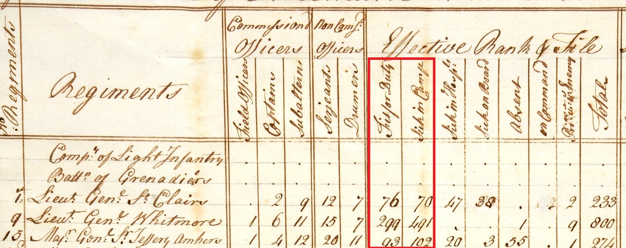 The image shows a weekly ‘return’ – a type of military document that became increasingly common in European armies across the seventeenth and eighteenth centuries. Under headings of ‘fit for duty’; ‘sick in camp’; ‘sick in hospital’, and so on, officers recorded numbers of officers and rank and file troops. These completed forms were then sent back to headquarters – in this case, the Secretary of War based in London – for officials to keep track of the total number of effective troops as well as rates of sickness, death, and desertion.